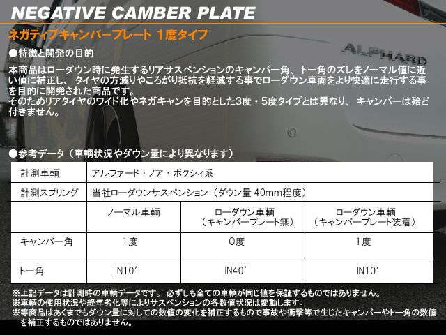 そのため3度や5度のアイテムとは異なり見た目のキャンバーは殆どつかず、リアタイヤのワイド化やリアキャンバーのネガティブ化には効果はありません。
